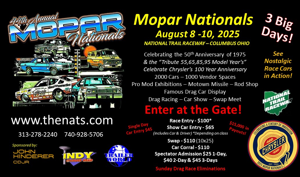 Welcome to Mopar Heaven: There is no other show that offers the participant as well as the spectators three action packed days (and nights) of everything MOPAR. With 2700 cars that represent all eras of the Chrysler brands, featuring classics, muscle cars, the high-performance new models and AMC's for a one of a kind everything Mopar weekend. You need to see the enormous showfield, special displays, activities for the kids, industry guests, and special awards and prizes. Interested in buying parts? Look no further!
