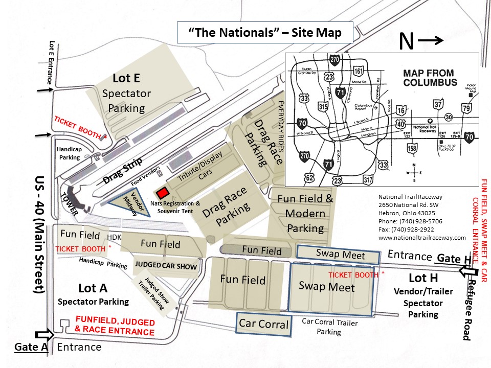 • From the North - Take I-75 south to the State Hwy. 15 exit. Go south, and the road turns into US- 23. Continue south until you reach the I-270 Beltway that circles Columbus. Go east on I-270 until you reach I-70. Take I-70 east to exit No. 122 (Rte. 158), then go north to US-40 (Main Street). At US-40, go east about 3 miles, and the track will be on your left side with parking on your left at Gate F, Gate G and Gate A (Paid). The spectator entrance/ ticket booths are at Gates A and D.